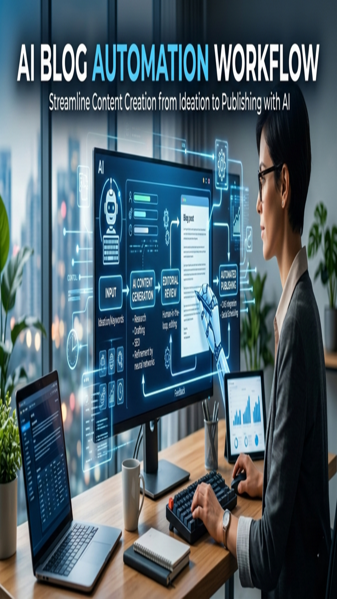 An AI blog automation workflow is a structured process that uses AI tools to assist with research, writing, optimization, publishing, and content distribution.
